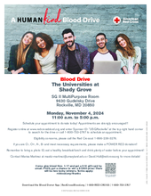 Join American Red Cross and University of Maryland School of Nursing for a Blood Drive at USG! Register online at www.redcrossblood.org and enter Sponsor ID: "USGRockville" at the top right-hand corner to search for the drive or call 1-800-733-2767 to schedule an appointment. For eligibility concerns, please call Red Cross at 1-866-236-3276. Remember to bring a photo ID, eat a healthy breakfast/lunch and drink plenty of water before your appointment.