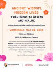 Join us for a special presentation by Dr. Jennifer Jimenez Marana to celebrate Asian American/Pacific Islander (AAPI) Heritage Month. This interactive presentation will explore the history and current relevance of a variety of traditional health and healing practices from countries such as India, Japan, China, and the Philippines.