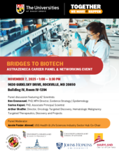 Bridges to Biotech (B2B) is a collaborative, multi-university career development event designed to connect life sciences master’s, PhD students, and postdoctoral fellows with Maryland’s biotech and biopharma industries. The event features a panel of biotech/biopharma professionals who will share their academic journeys, discuss their transition into industry, and offer candid insights into what it’s like to work in the biotech sector. Panel discussion featuring AstraZeneca Scientists: