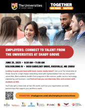 Looking to grow your team with local, career-ready talent? Join us at The Universities at Shady Grove for a high-impact networking event with representatives from our nine partner universities. Meet academic leaders from programs in life sciences, public service, technology, engineering, and business—and find out how you can interview, hire, and connect with students at USG.