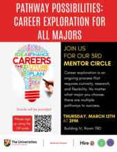 Career exploration is an ongoing process that requires curiosity, research, and flexibility. No matter what major you choose, there are multiple pathways to success. This guest mentor will walk students through an exercise to translate their degrees and skill sets into career possibilities.
