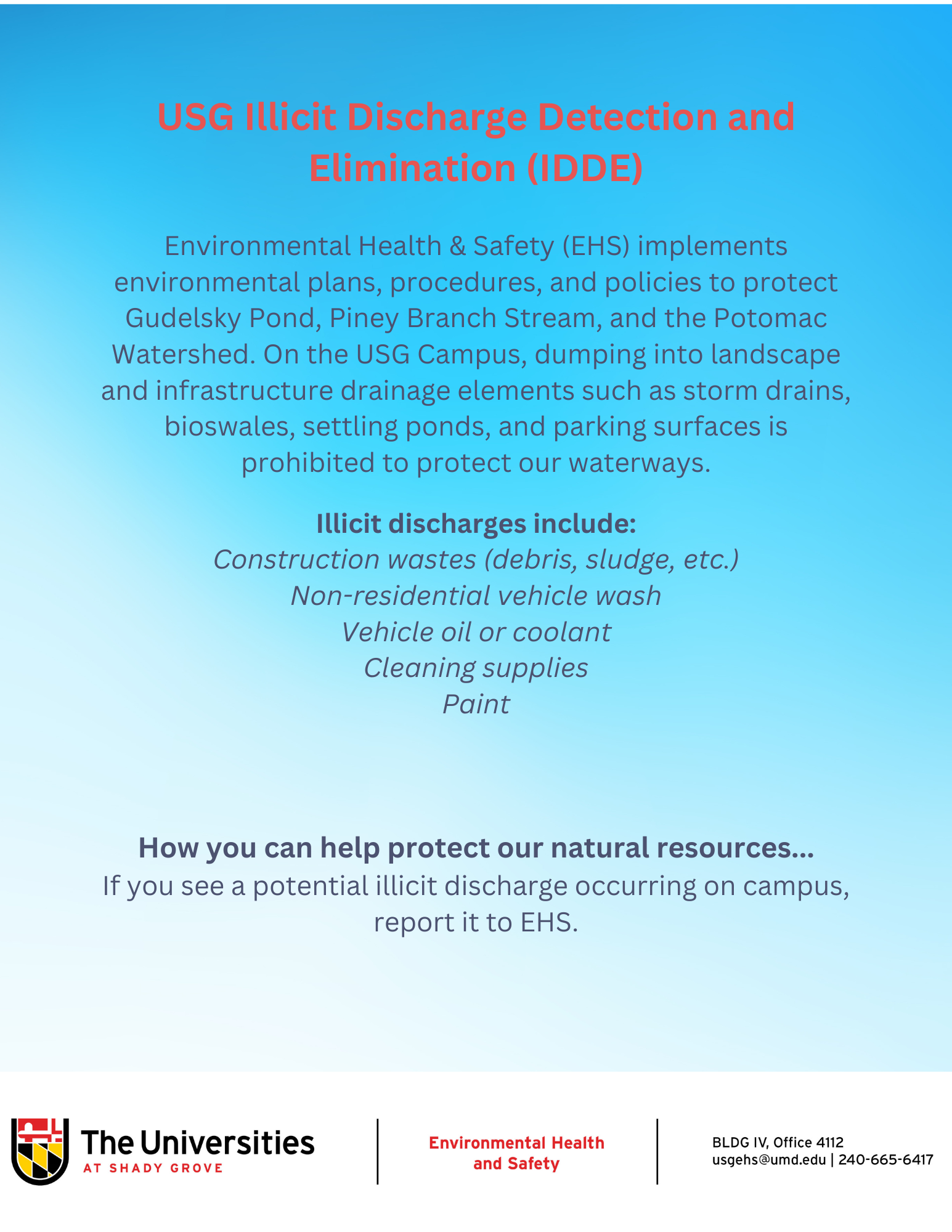 USG maintains compliance with federal and state environmental regulations and overall protection of environmental resources. Staff work closely with University System of Maryland, College Park in managing environmental risk by overseeing policies, procedures, and education and training programs.