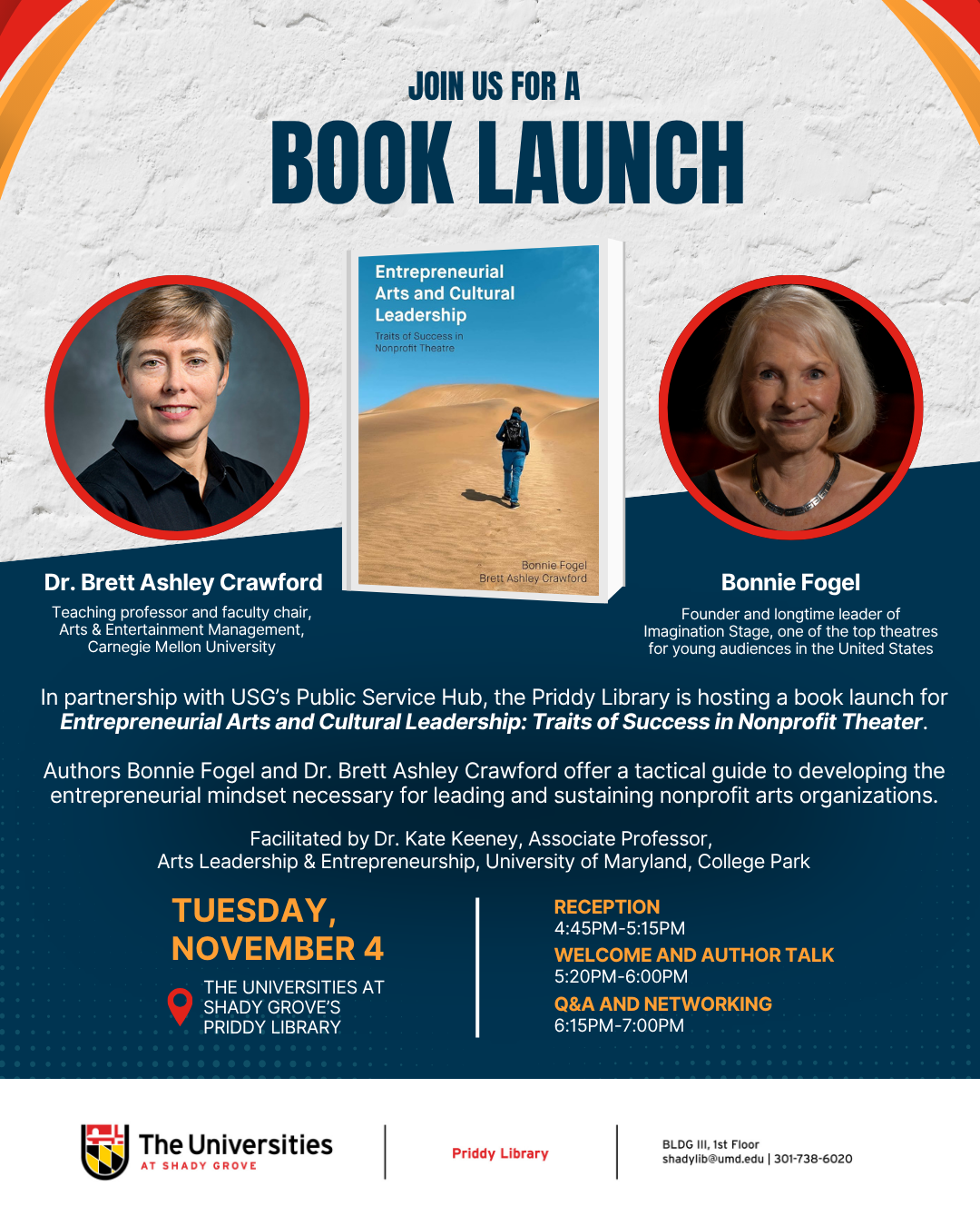 In partnership with USG’s Public Service Hub, the Priddy Library is hosting a book launch for Entrepreneurial Arts and Cultural Leadership: Traits of Success in Nonprofit Theater.