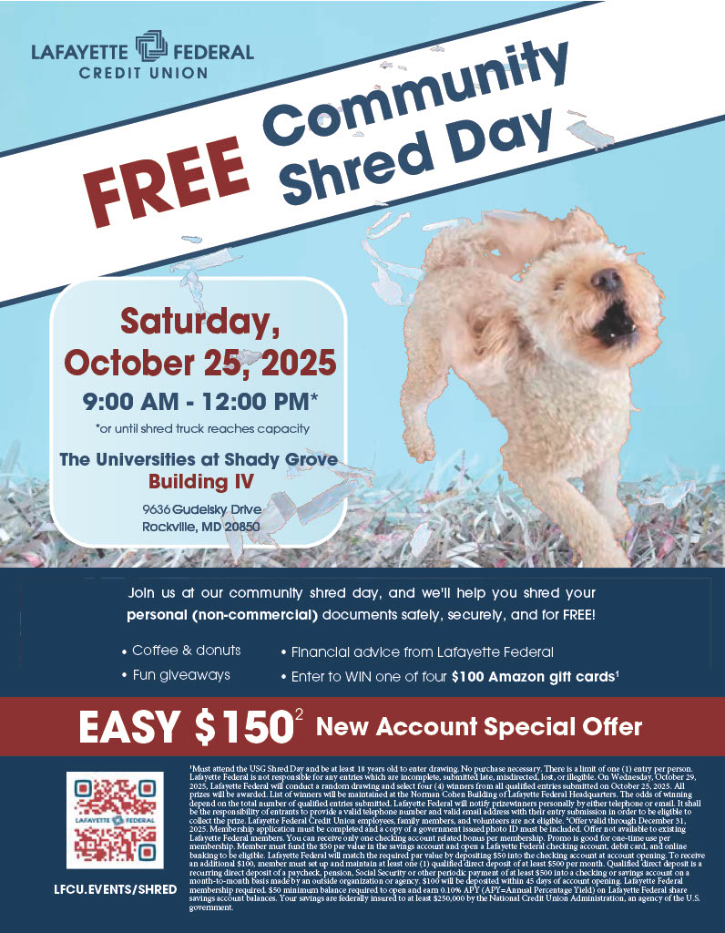 For more informaiton, visit: https://www.lfcu.org/event/shred-day-the-universities-at-shady-grove/#