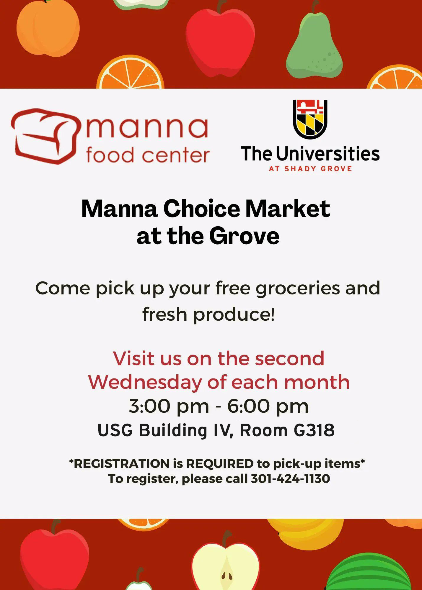 USG is proud to partner with Manna Food Center to offer Manna Choice Market at the Grove! Launched in 2022, this program will bring a market-style distribution of food right on campus starting in August 2022. On the second Wednesday of every month, students and their families will be able to access our market to select fresh produce and other perishable and nonperishable healthy foods.