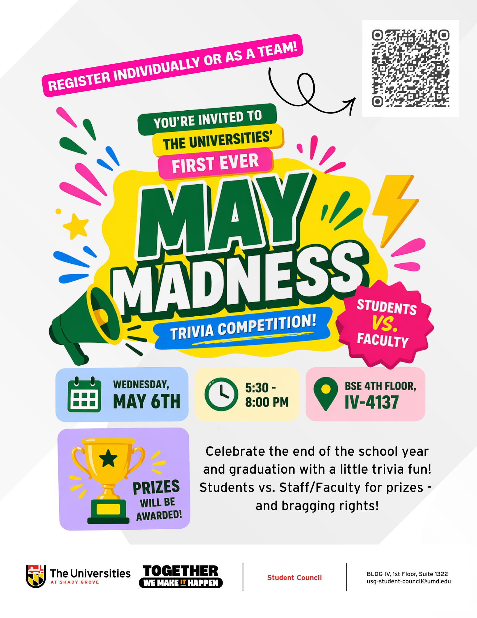 Celebrate the end of the school year and graduation with some friendly competition! Students vs. Staff/Faculty trivia night for prizes - and bragging rights! Pizza and snacks will be provided!