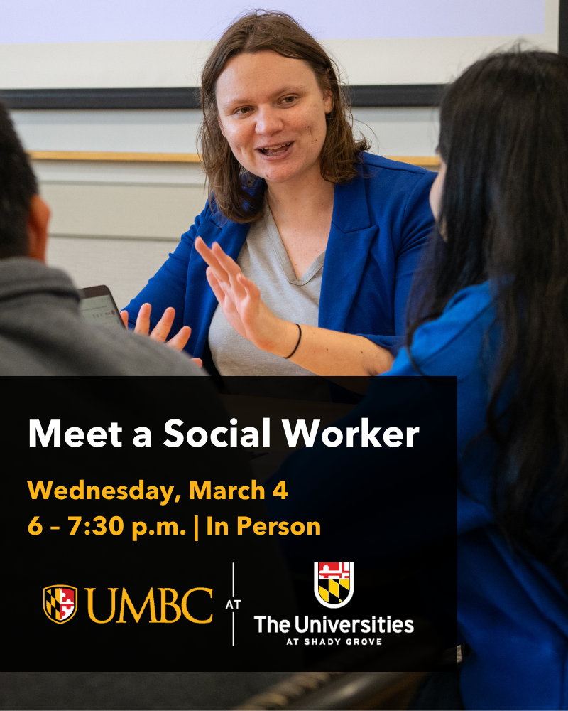 Build personal connections with professional social workers at this interactive event for current and future UMBC-Shady Grove students. Through rotating small groups, you’ll gain firsthand insights into the profession’s unique rewards and challenges. Join us to explore the amazing field of social work and the many ways you can make a difference in our community. Plus, come early to explore USG through a campus tour!