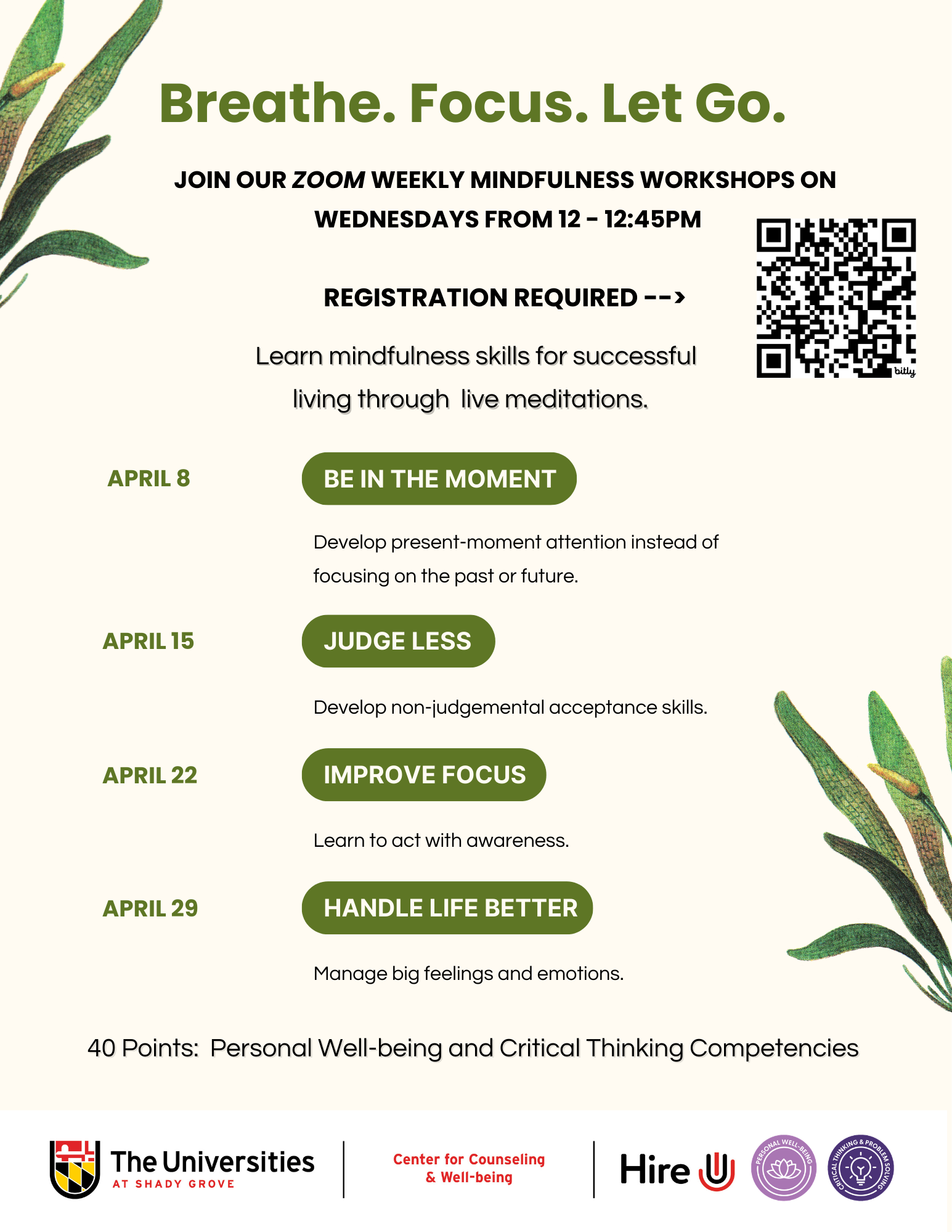 Who Can Attend Students Faculty Staff Location Virtual Time Wed, Apr 15 2026, 12 - 12:45pm Image Join us for relaxing mindfulness workshopsVirtual Wednesday 12-12:45 pm April 8April 15April 22April 29 Contact Information Roxanne Issurdatt (roxannei@umd.edu)