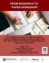 Who Can Attend Students Faculty Staff Location Building IV, Suite 1322 Time Gain confidence and tools to better manage the process of writing an academic research paper using APA style. Similar to the Writing and Citing with APA workshop, so choose one or the other! Contact Information gnatali@umd.edu Register for the Event