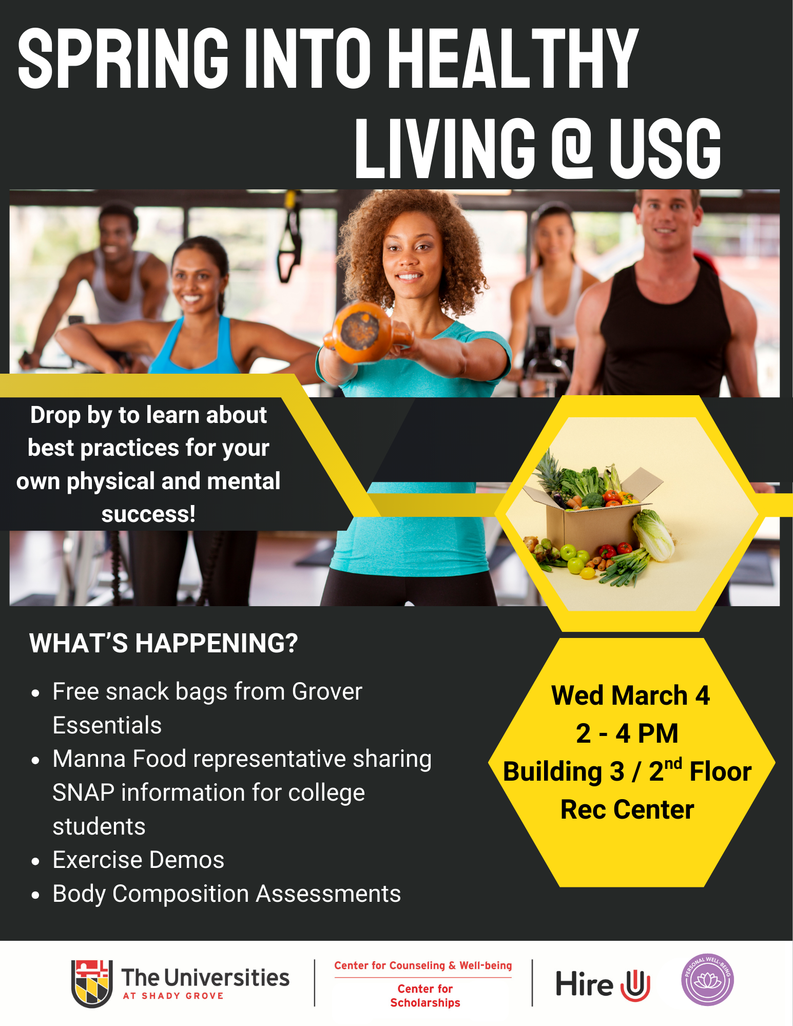 Get the new season started in a fresh, healthy way! The Center for Counseling and Well-Being alongside the Center for Scholarships will be hosting an afternoon revolving around best practices and guidance on living safely. Representatives from Manna Food Bank will be present to provide SNAP benefit information, and Salisbury's Exercise Science program will showcase physical demonstrations. Free snack bags and toiletries will be available for all student attendees provided by the Grover Essentials program. Decompressing, physical finessing, and food accessing; take some time to stop by and help yourself!