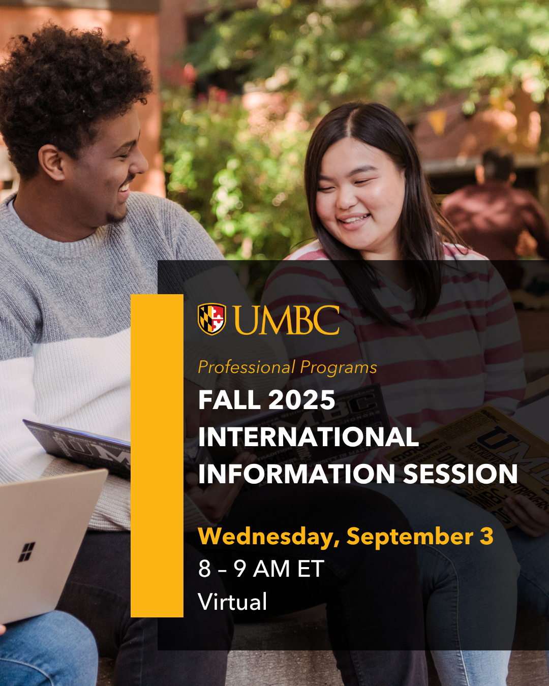 UMBC’s Professional Graduate Programs are proud to welcome students from around the world. If you’re an international student hoping to earn a professional master’s degree or graduate certificate from UMBC, join our Fall 2025 International Info Session.