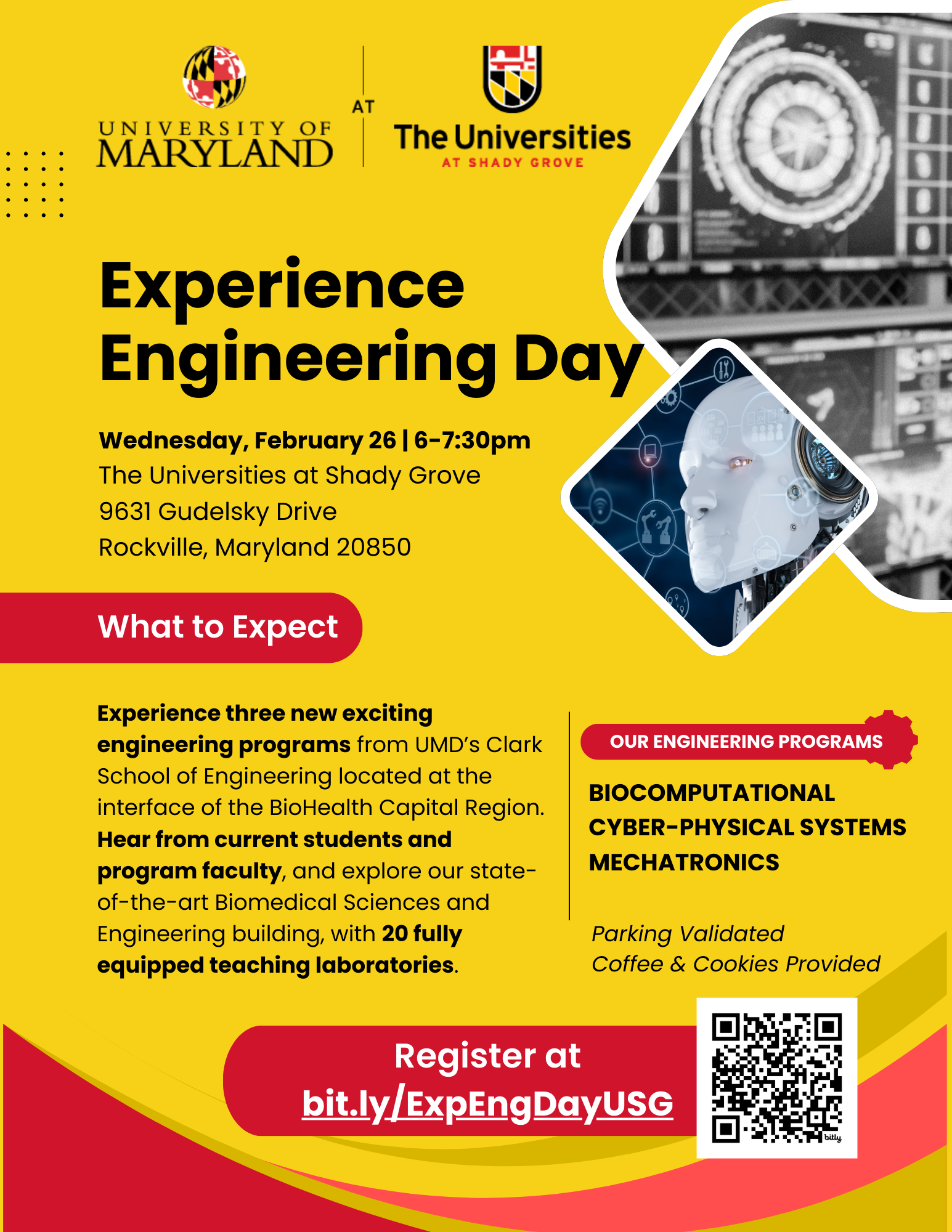 Experience three new exciting engineering programs from UMD’s Clark School of Engineering located at the interface of the BioHealth Capital Region. Hear from current students and program faculty, and explore our state-of-the-art Biomedical Sciences and Engineering building, with 20 fully equipped teaching laboratories.