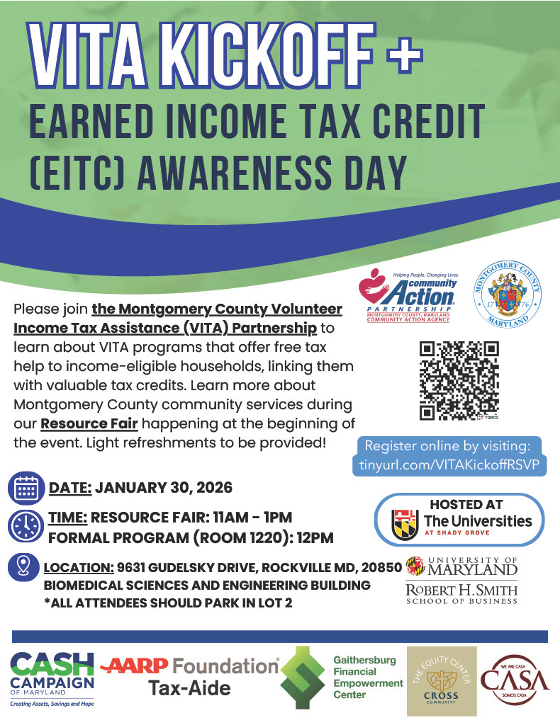 Please join the Montgomery County Volunteer Income Tax Assistance (VITA) Partnership to learn about VITA programs that offer free tax help to income-eligible households, linking them with valuable tax credits. Learn more about Montgomery County community services during our Resource Fair happening at the beginning of the event. Light refreshments to be provided!