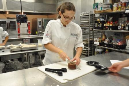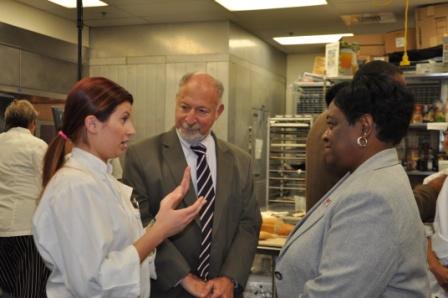 Dr. Bell attended HRM’s Bread Baking Basics course led by UMES faculty chef, Susan Callahan, where each student prepared and presented a special recipe. Here student, Jennifer Dean, serves Jamaican Rum Cake. |
