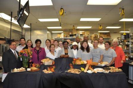 Dr. Bell and Dr. Walker meet in the Marriott Teaching Kitchen with students of the UMES Hotel and Restaurant Management Program and UMES faculty at USG, including HRM program director, Ruth Lee (3rd from left), and Construction Management Technology program director, Bijan Shapoorian (far left). |